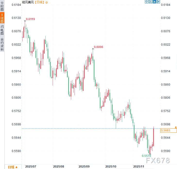 汇通财经APP讯——周三(11月26日)亚市时段,纽元兑美元显著攀升至与近三周高位0.5685附近,涨幅约1.17%