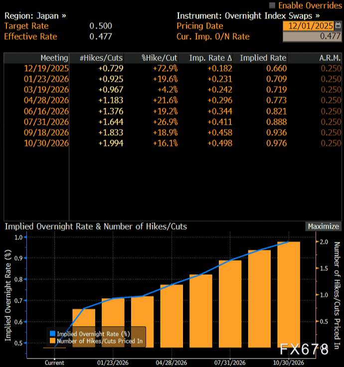 市场对植田和男的讲话做出了明确反应。根据隔夜指数互换定价显示,交易员目前预计日本央行在12月19日会议上加息25个基点的概率已达73%,较上周末的57%大幅提升。市场定价已反映明年10月前将累计加息两次,隔夜利率预计将突破1%水平。