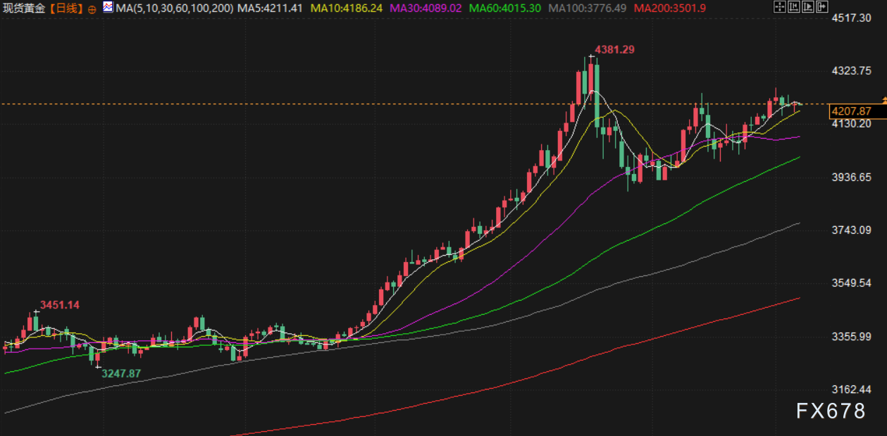 周五(北京时间12月5日)亚市早盘,现货黄金交投于4207.50美元/盎司附近,金价周四基本持稳,呈现出多空因素拉锯