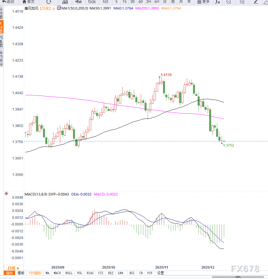 整体技术信号显示,USD/CAD短期承压,需关注美加关键数据发布后的波动情况。
